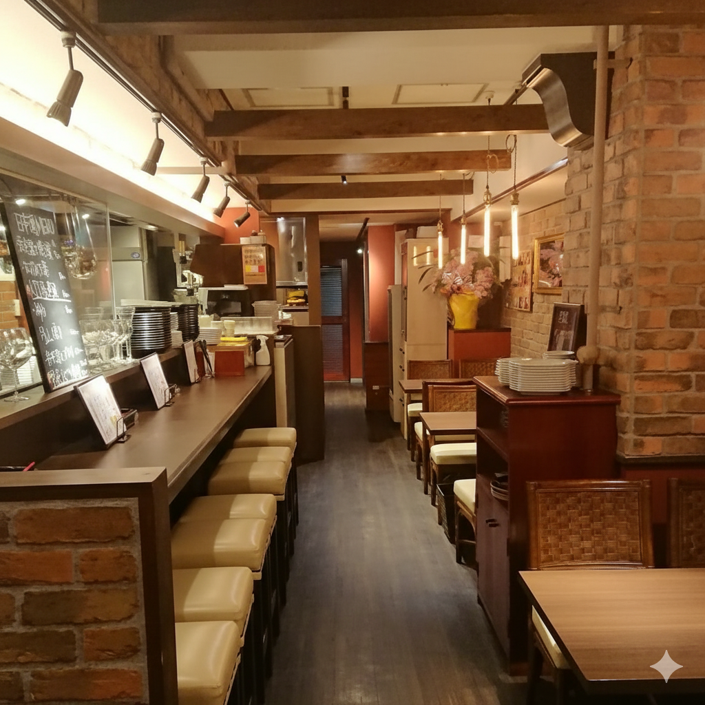 扉を開けると、そこには活気と温かみが同居する心地よい空間が広がります。オープンキッチンから聞こえるリズミカルな調理の音、そしてふわりと鼻孔をくすぐるソースの香り。カウンター席に腰掛ければ、目の前で繰り広げられるシェフの無駄のない動きに、これから始まる美食体験への期待感が高まります。