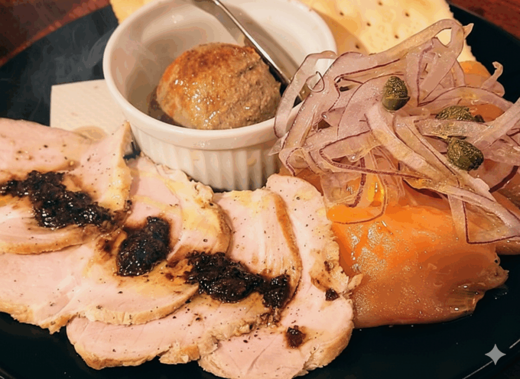 まずは、ローストビーフを一枚。口に運ぶと、驚くほど柔らかく、噛むほどに上質な赤身肉の旨みがじわりと広がります。丁寧な火入れによって閉じ込められた肉汁が、口の中で溢れ出す感覚は、まさに至福の瞬間です。