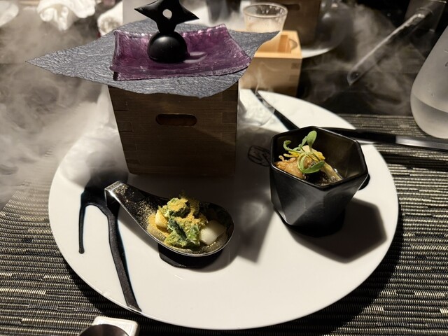 コースの序盤から、忍術は惜しみなく繰り出されます。例えば、小さな玉手箱を開けると、ふわりと煙が立ち上り、中から美しいアミューズが現れる。あるいは、忍者の武器である「手裏剣」を模したクリスピーなクラッカーが、ディップと共に供されることも。