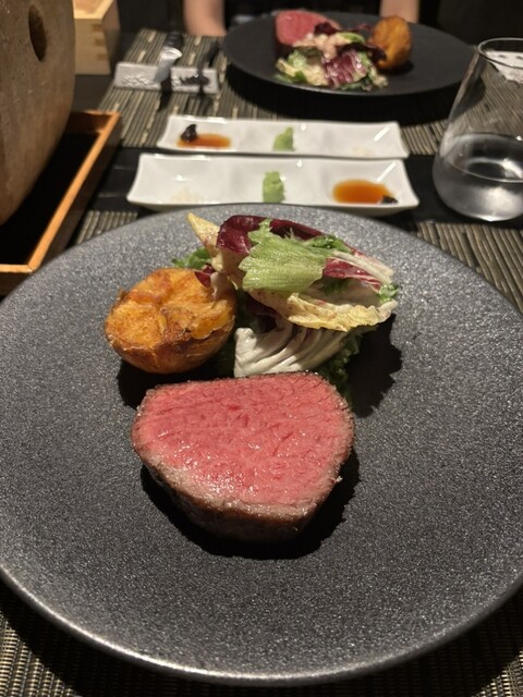 数々の驚きに満ちた料理の後、満を持して登場するのがメインディッシュです。ウェブサイトでも大きく紹介されている「近江 澤井牛」のステーキは、この店の「核」とも言える一品。