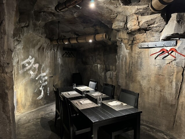 大手町というビジネスの中枢。そのビルの地下階に、お店の入り口はひっそりと佇んでいます。しかし、自動ドアが開いたその先は、すでに別世界。薄暗い洞窟のような通路に足を踏み入れると、どこからともなく黒装束の「忍者」が現れ、私たちを「忍びの里」へと導いてくれます。