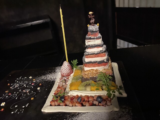 日本の城を模した壮大なデコレーションは、まさに圧巻。焼き菓子やクリーム、美しいフルーツで華やかに盛り付けられたプレートは、思わず写真に収めたくなるインパクトです。見た目の楽しさだけでなく、パティシエの技術が光る本格的な味わいとのことで、特別な夜を締めくくるのにふさわしい一皿でしょう。