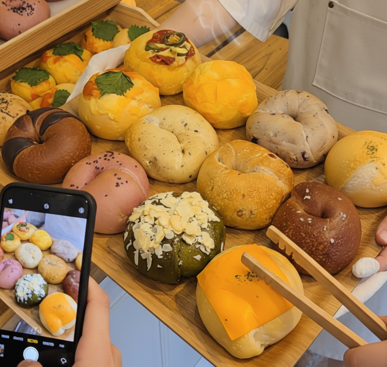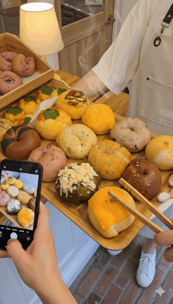 ベーグル生地そのものの美味しさはもちろん、それをキャンバスとして描かれるクリームチーズや具材の組み合わせが、とにかく独創的。定番のものから、「ドバイチョコ」のようなエキゾチックな名前のものまで、どれもが「パン」という枠を超え、一つの「作品」として完成されています。